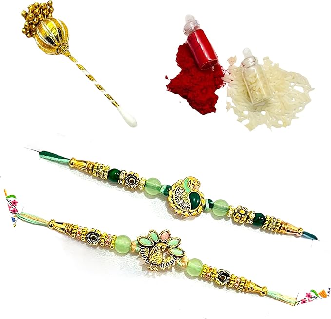 NiLy Craft 2 Pcs Brother Sister Rakhi Gift Set | Unique Green & Pista Mor/Peacock Charm Rakhi with Mix Color Pure Cotton Threads | Includes Tika Stick, Roli (Kumkum), Chawal (Rice) | Traditional Raksha Bandhan Combo for All Ages