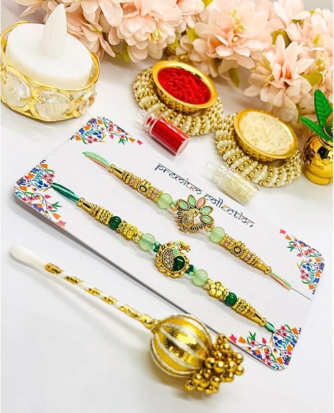 - 💚 Unique Green & Pista Design: Features two beautifully handcrafted Rakhis – one with an elegant Mor (peacock) green charm and the other with a pista shade Mor (Peacock) charm, symbolizing love and Uniqueness.